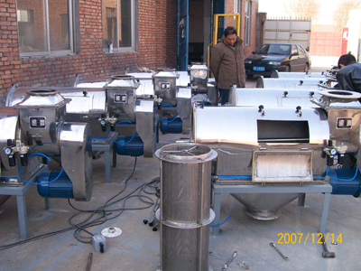 本設(shè)備篩網(wǎng)為圓筒狀,置于機體內(nèi),物料通過螺旋輸送系統(tǒng)后,和氣流混合、霧化進入網(wǎng)筒內(nèi);通過網(wǎng)筒內(nèi)風(fēng)輪葉片使物料同時受離心力和旋風(fēng)推進力,從而迫使物料噴射過網(wǎng),由細(xì)料排出口排出,不能過網(wǎng)的物料沿筒壁從粗料排出口排出。